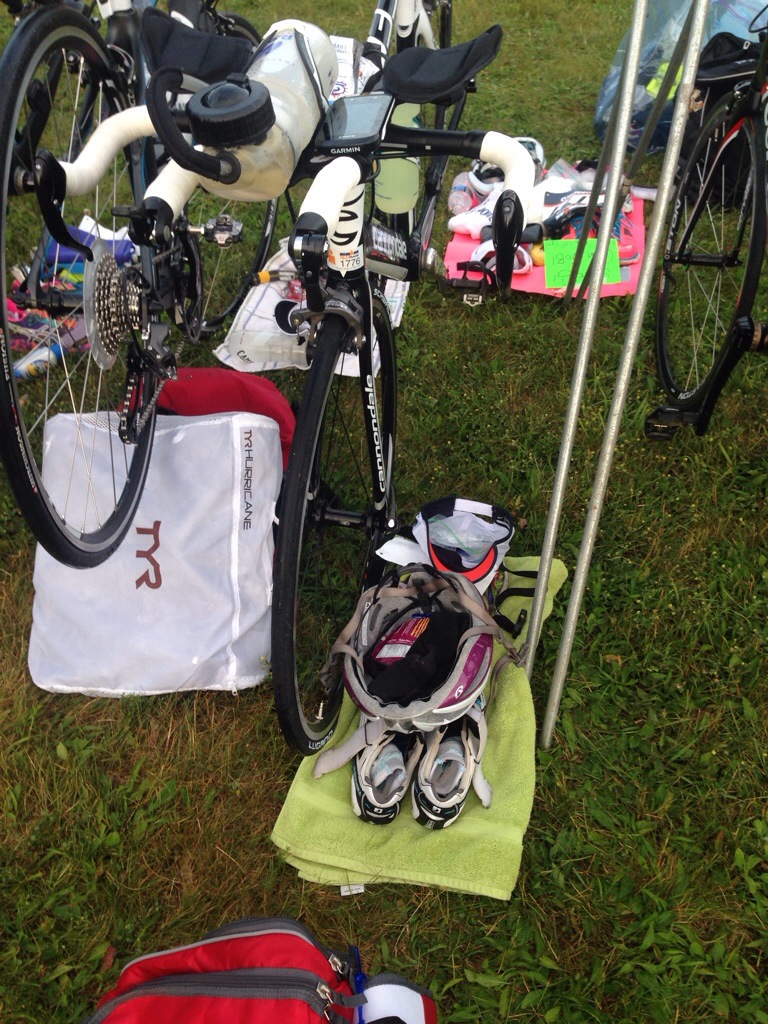 Arrive at the park, head to transition to set up, after body marking, prep bike – blow up tires, tape gels to bike stem, water bottles placed, bike computer placed, lay out sneakers, running belt, hat, bike shoes, helmet, sunglasses and nutrition for the day.