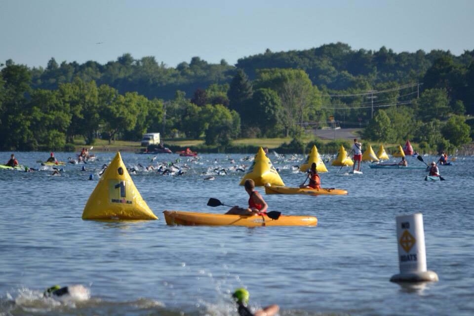 After wading out to the start buoys and waiting our 5 minutes between the swim waves, the horn blew and we were off for the swim. Again, I was super relaxed (strangely, but thankfully, so).