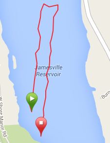 I don’t know what it is about the swim out, but it always seems to take f-o-r-e-v-e-r to reach the turn, when I reached the red buoy I checked my watch an noticed I was a little over 15 minutes – a decent pace! I swam over to the next red buoy, turned right to head back into shore and picked up the pace a bit. The swim back was much like the swim out, off course but minimal interruptions from other swimmers. According to my watch, I swam 1.3 miles, and came out with this lovely zig-zag pattern…
