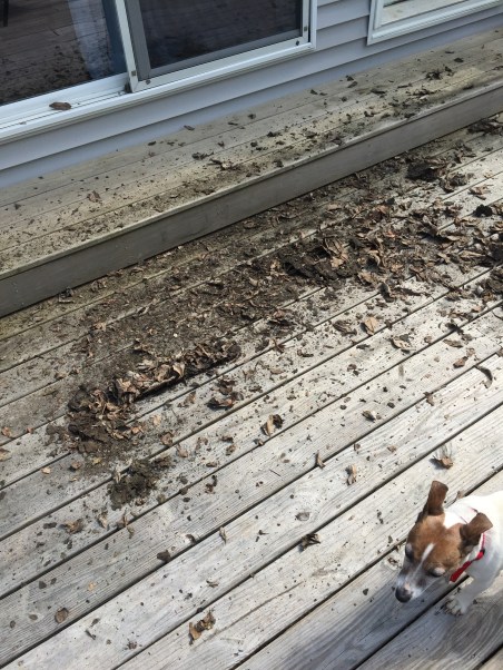 So, I have a little problemo with the sand washing out from under my deck… turns out the prior owners never cleaned out the gutters. This is what approximately 7 years of leaf debris looks like as it comes out of the gutters. (As you can see, Roxie was just about as impressed as I was…)