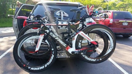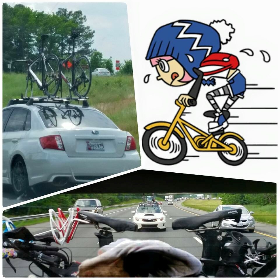 Anyhow… on Friday my coach and a couple of the other T2 athletes met up at my coaches house, packed up the car and started our trek from Syracuse to Raleigh. After an entertaining 12 hours in the car (traffic held us up in DC a bit…) we made it to Raleigh just in time for packet pick up. We had a blast driving down south, I was amazed at how quickly the ride went! We may or may not have raced a couple of guys in their little Subaru with bikes on top, found inspiration for packing our next road trip, missed taking pictures of almost every state sign, and were in awe of some things that could be purchased in c-stores in the south. It was a good day. (see pictures below…)