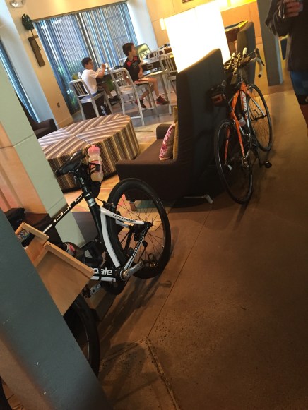 The boys in the background wanted to know why they didn’t get to bring their bikes to the hotel after seeing us roll ours out of the elevator and into the lobby. 🙂
