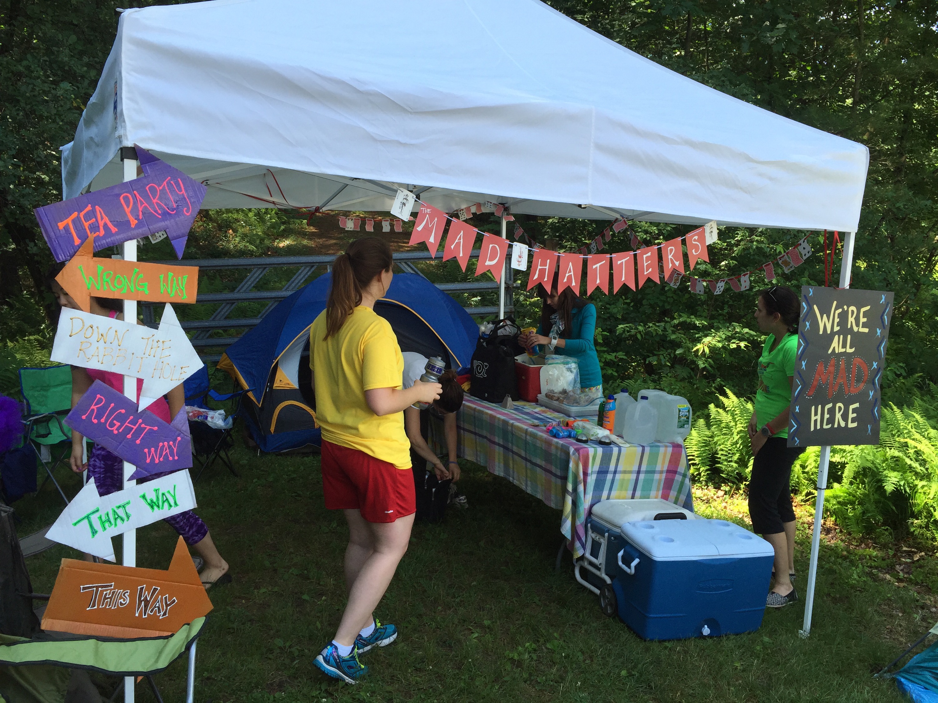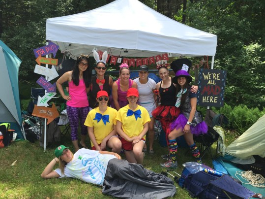 at we should dress up as the characters from Alice in Wonderland so I quickly assigned her the duty of being the Mad Hatter. She did not disappoint. Seriously, her costume was amazing. In fact, the entire team totally got into it and I think we all had some pretty kick@$$ outfits. Especially KK who joined the team with only 1 week notice and had just completed the Syracuse 70.3 the prior Sunday. She saved our tails from having to run extra legs, AND ended up playing the roll of Team Mom since she brought EVERYTHING we could EVER need for camping. – Seriously. She even had a vacuum! Prepared friends are good to have.